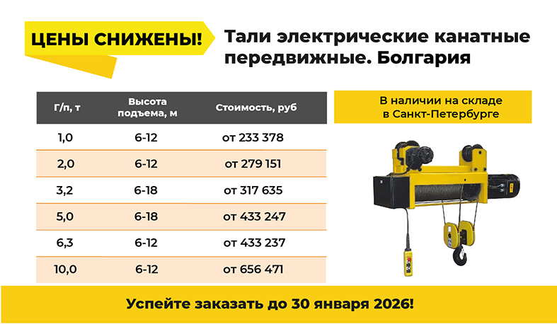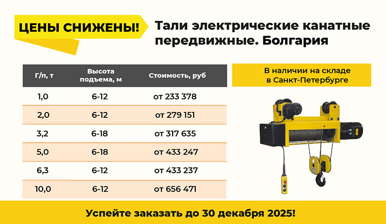 «Торговый дом Элеватормельмаш» снизил цены на тали электрические канатные передвижные с нормальной строительной высотой производства Болгарии. В наличии на складе в Санкт-Петербурге тали грузоподъемностью от 1,0 до 10,0 тонн. Доставка во все регионы России.